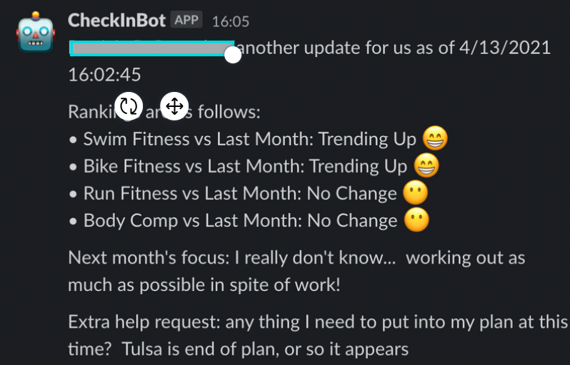 You have plenty of options here. Inside Endurance Nation, I place my reply inside that slack channel and tag my assistant. My assistant will then copy that reply and place it into the athletes online space where we communicate tagging the athlete.